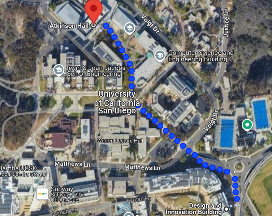 It is a short 10 minute walk from the Central Campus trolley stop to Atkinson Hall, route seen above.